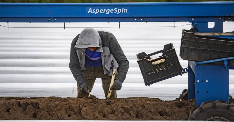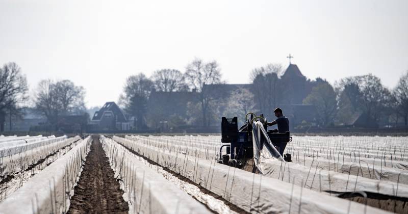 In maart wordt er folie op de bedden gelegd, om verkleuring tegen te gaan, de grond lekker warm te houden en hierdoor de oogst te vervroegen. Om het groeiproces nog meer te versnellen, wordt over de folie nog een transparante folie gelegd, een zogenaamde mini tunnel. Als het tijd is om te oogsten, wordt de folie opgelicht en als er een barstje in de grond zit of de asperge zichtbaar is, kan hij worden gestoken. De gestoken asperges worden direct in koud water gelegd gedurende 6 uur. Dit is om verkleuring te voorkomen. Daarna worden ze gesorteerd op kwaliteit (kleur, dikte en lengte).